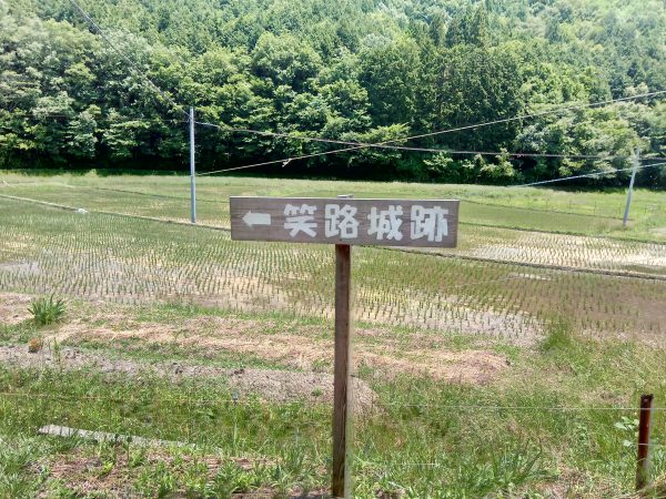 次は「笑路城址」です。既に12時を過ぎていたのですが、昼食は城址で食べたい、ということで向かいました。「笑路城址」はR423の「笑路」交差点付近から農道に入ります。ちゃんと案内看板も立っています。