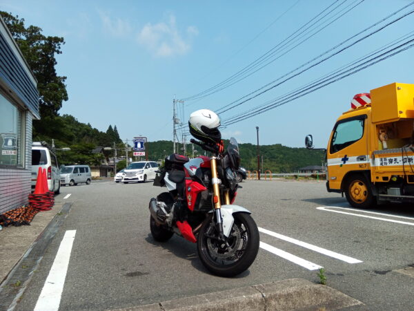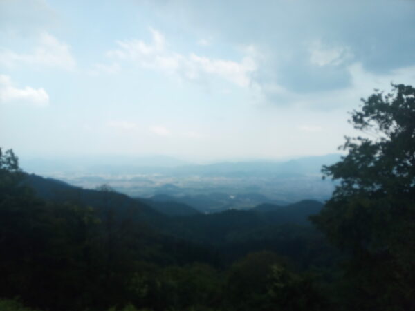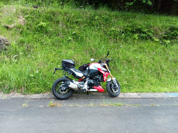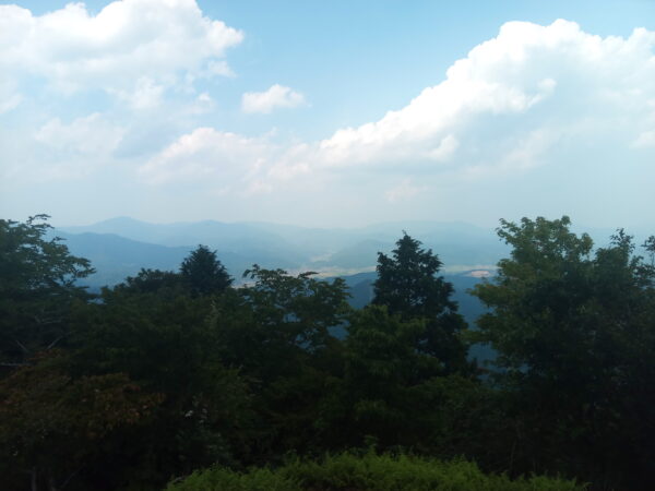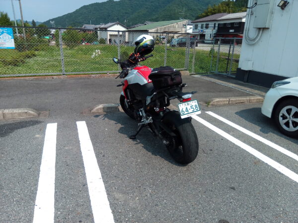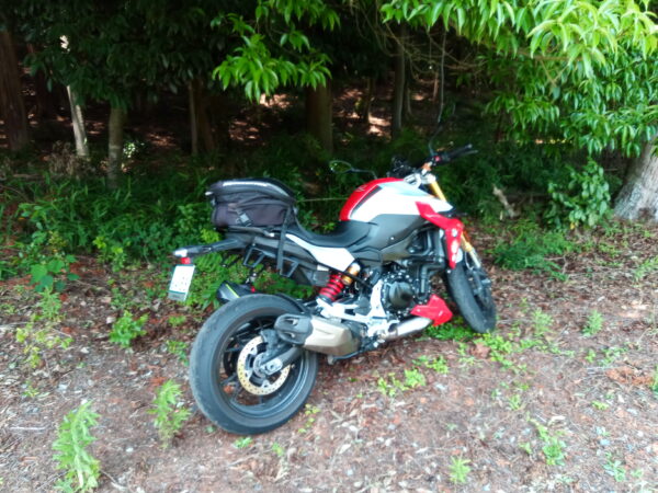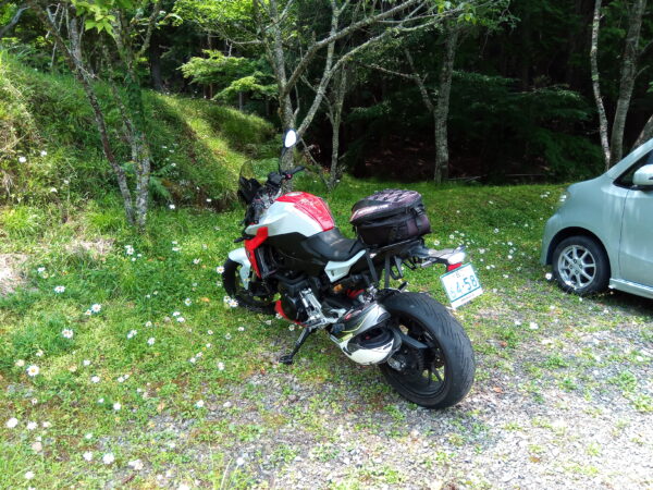 山頂で昼食を食べようとしたら雨が降ってきたので、先ほどの東屋で雨宿り兼昼食にしました。15分程度で雨は止んだのですが、バイクとヘルメットがどうなっているか心配でした。(木陰で少し被害が抑えられていました。)