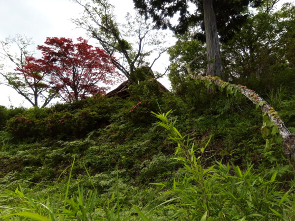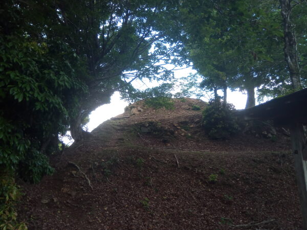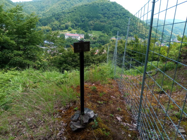 山を左手に迂回しながら登ると「土塁」跡がありました。山頂に「本郭」跡(東屋が建てられているようでした。)が見えるのですが、害獣対策フェンスのせいで登れません。ぐるりと迂回すれば、どこかにフェンスを開けられる場所があると思いますが、フェンス内が藪状態だったのと、予定している城址があるため眺めるだけで諦めました。