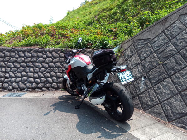 バイクは道端に駐めました。バイクの背後の山が城山です。