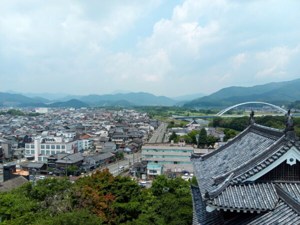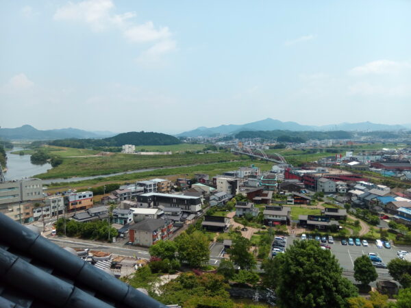 再建された「福知山城」の説明看板と「天守」からの眺めです。「鬼ヶ城城址」の山も見えるみたいです。(どれだかわからなかったけど・・・)