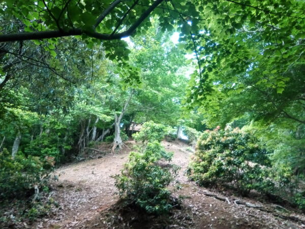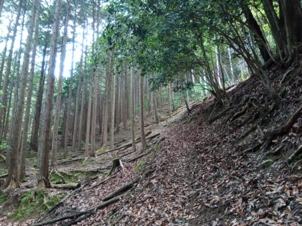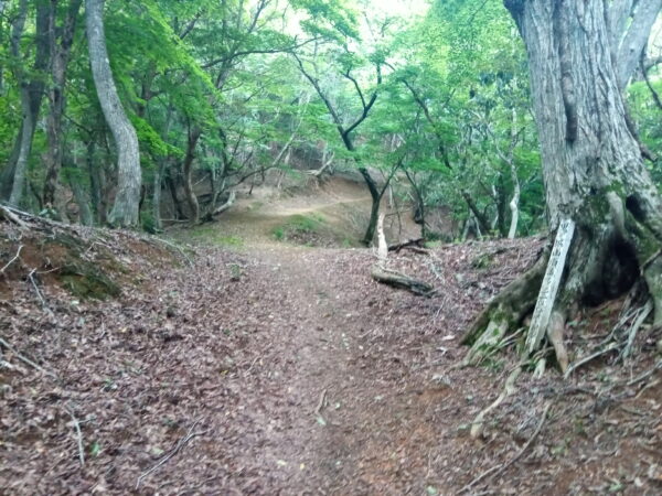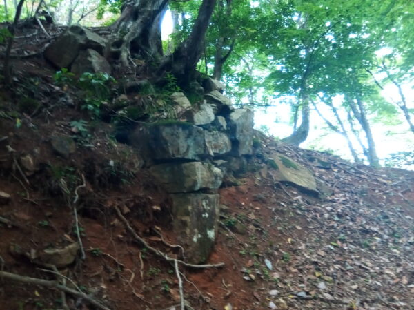 比較的緩やかな登山道。石垣の遺構と思われる場所もあります。