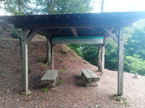 「鬼ヶ城城址」への最後の難関がこの急坂です。途中の案内看板に「メモリアル森林」というのが出てくるのですが、「鬼ヶ城城址」の手前に植樹した場所があり、東屋が設置されていました。