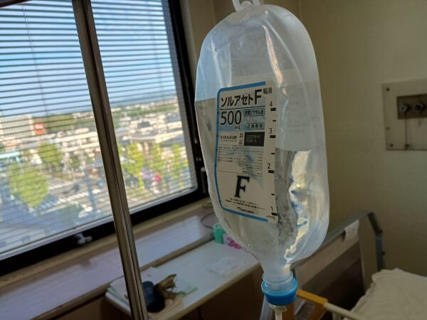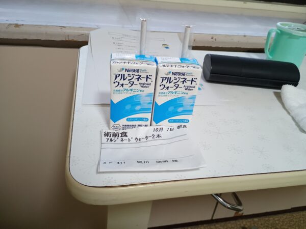 10月7日(火)の手術当日は、0時から水分取得不可、朝から絶食です。唯一栄養ドリンクぽい「アルジネードウォーター」は2本飲めました。手術開始予定は昼頃です。