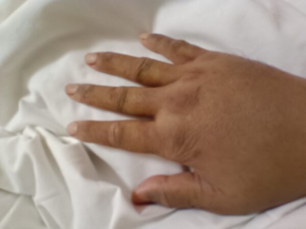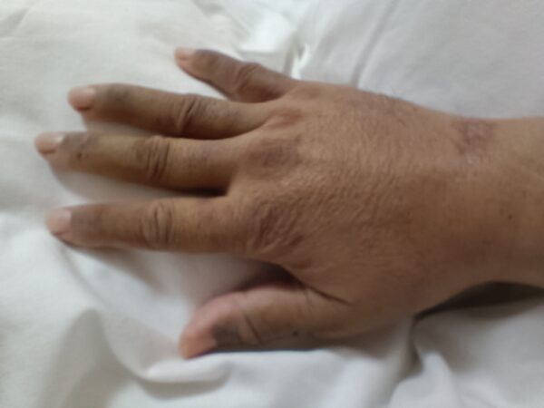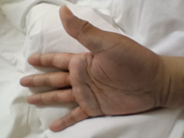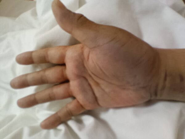 右腕は添え木+包帯や包帯ぐるぐる巻きだったので、自分の手を観たことがありませんでした。腫れて動きにくいことは自覚していましたが、ほとんどグローブやん。写真だとそうでもありませんが、手の甲は真っ黒で、手のひらは一面青あざでした。よく骨折しなかったものです。その後の入院期間中は1日2回アイスノンでアイシングしました。