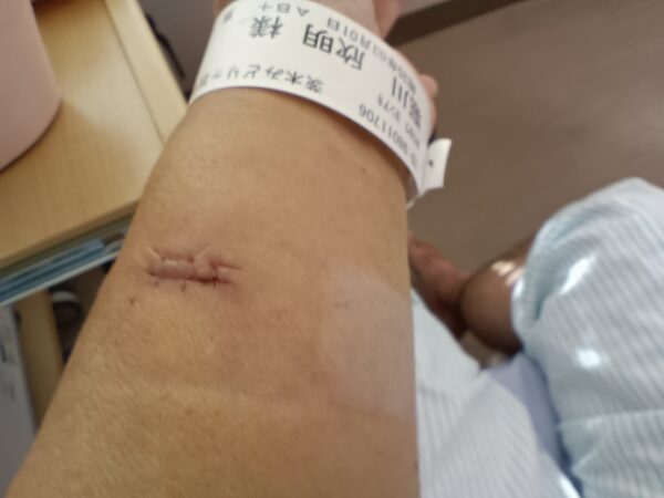 担当医と退院後の治療について面談した後で、「京都桂病院」で縫った傷の抜糸をしてもらいました。これで左手はすっきりです。
