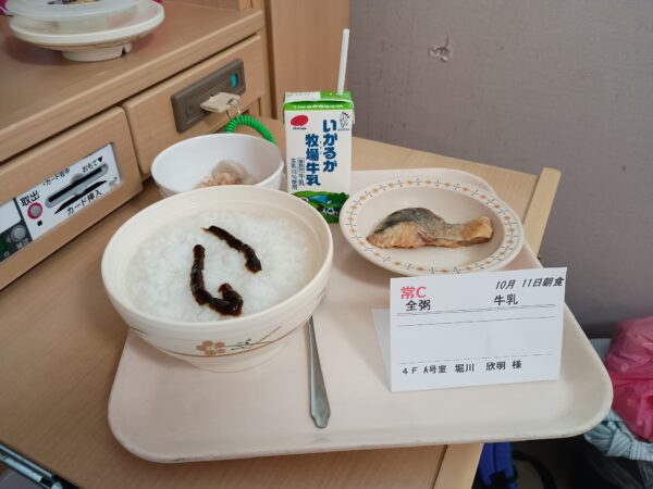 10月11日(土)の朝食です。この後、10時頃に退院しました。入院費は「第三者行為による傷病届」で処理し、それ以降の通院は全額支払うことになりました。(そのうちに自賠責の対応があるだろうとのこと。)